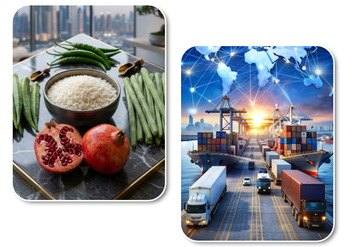To empower global kitchens by manufacturing and exporting the highest quality IR64 rice and fresh Indian produce. We strive to maintain a seamless supply chain, ensuring that premium agricultural excellence reaches every international market with absolute purity and nutritional value.